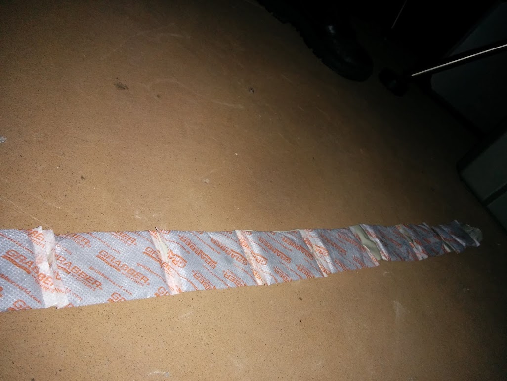 The solution was rather quite simple – 8 hand wamers (probably could have gotten away with using 6) attached to a strip of duct tape. Kevin was rather doubtful at first, but I think he’s learned to trust my crazy ideas and was game to go for it. So a quick mental calculation (c=2πr – high school math ftw) gave me a length of roughly 25 inches to go around the circumference of an 8″ mirror. Kevin took out his roll of duct tape (with a space pattern instead of the usual grey!), cut a 28″ strip and laid it down, sticky side up. Hand warmer packets were opened, activated with a couple of minutes of energetic shaking, and lined up along the length of the tape. This was then attached to his optical tube as shown in the image below.