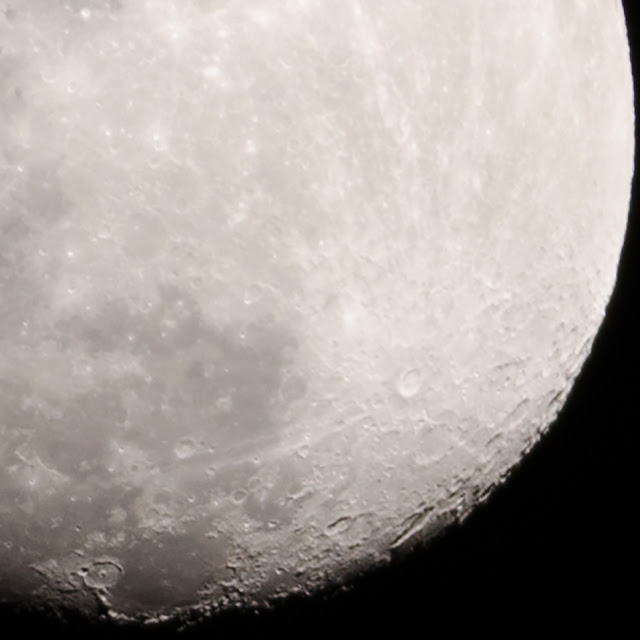 But zooming in on said image and examining it closer, fine detail shows that there is some visible pixellation and noise. Fine details such as craters are a bit blurry due to atmospheric distortion. And since the moon is so bright due to its advanced waxing gibbous stage, there’s very little contrast between light and dark areas.